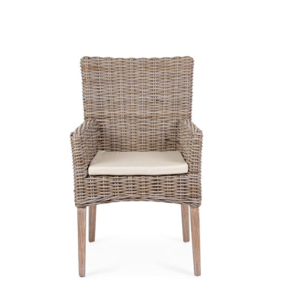 Poltroncina da esterno in mogano intrecciato Kubù, dal design classico e accogliente. Completa di cuscino sfoderabile in poliestere, è comoda, pratica e ideale per creare un elegante angolo living in giardino o terrazzo. Si consiglia l’utilizzo in ambienti coperti.