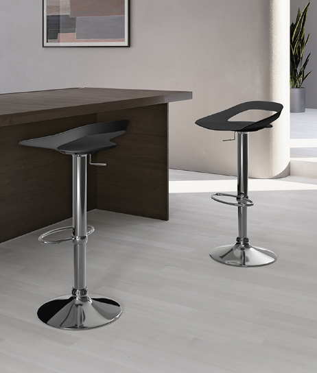 Sgabello regolabile con seduta in polipropilene nero e struttura in metallo cromato. Altezza regolabile, pratico e ideale per cucina o bar.