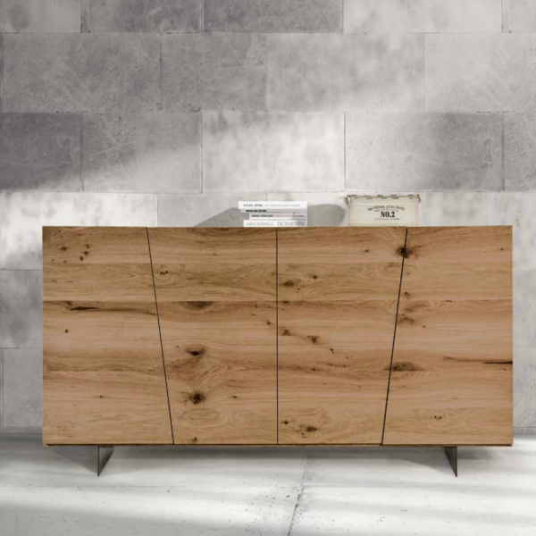 Madia in rovere nodato spazzolato con quattro ante e piedi in metallo. Capiente, elegante e dal design contemporaneo, perfetta per arredare il soggiorno con stile e funzionalità.