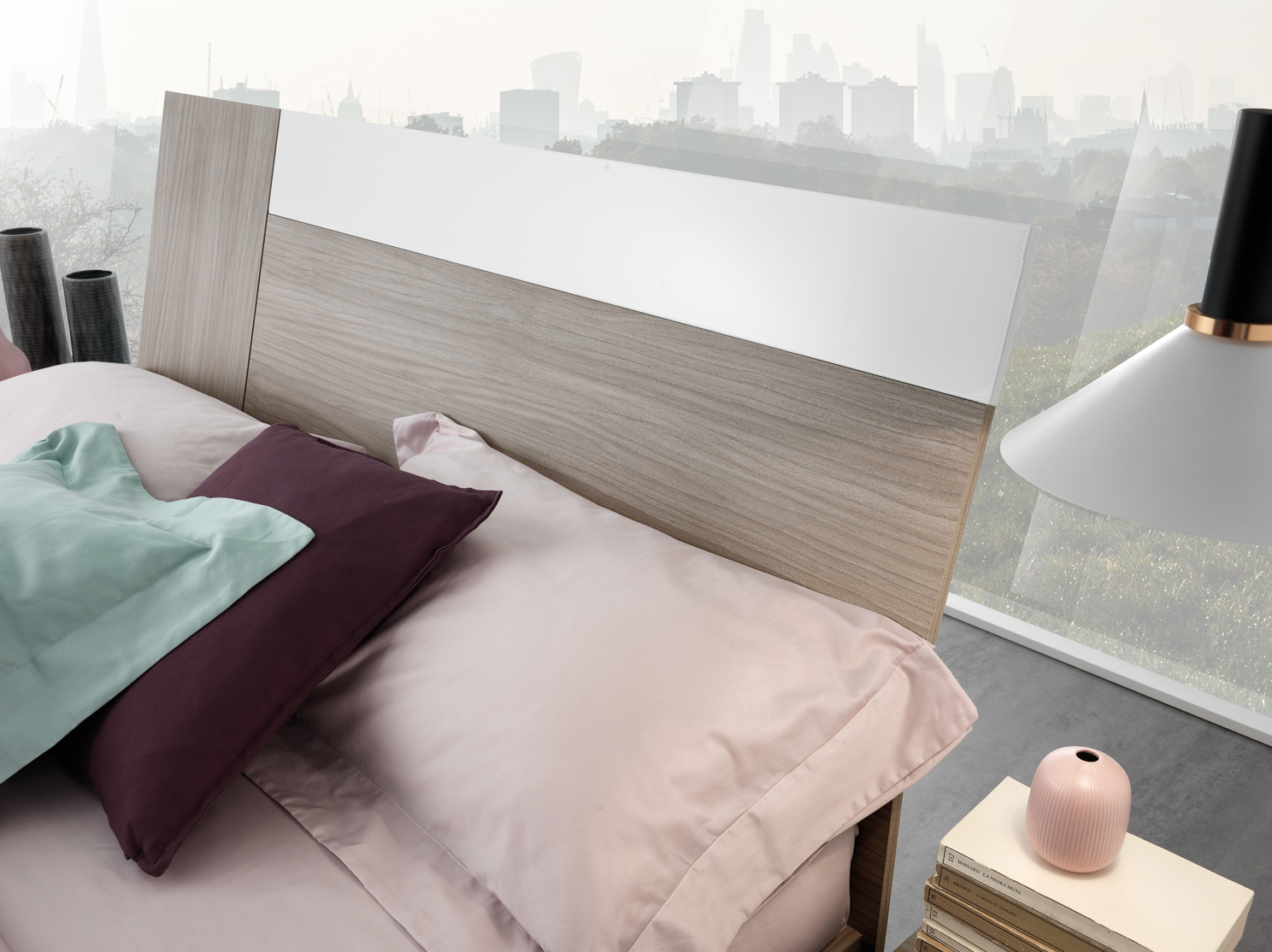 Il letto matrimoniale (L 170 cm, P 210 cm, H testiera 110 cm) rappresenta il punto focale della stanza, con una testiera importante che valorizza l’intero arredamento. È disponibile anche nella versione contenitore, ideale per chi desidera ottimizzare gli spazi.