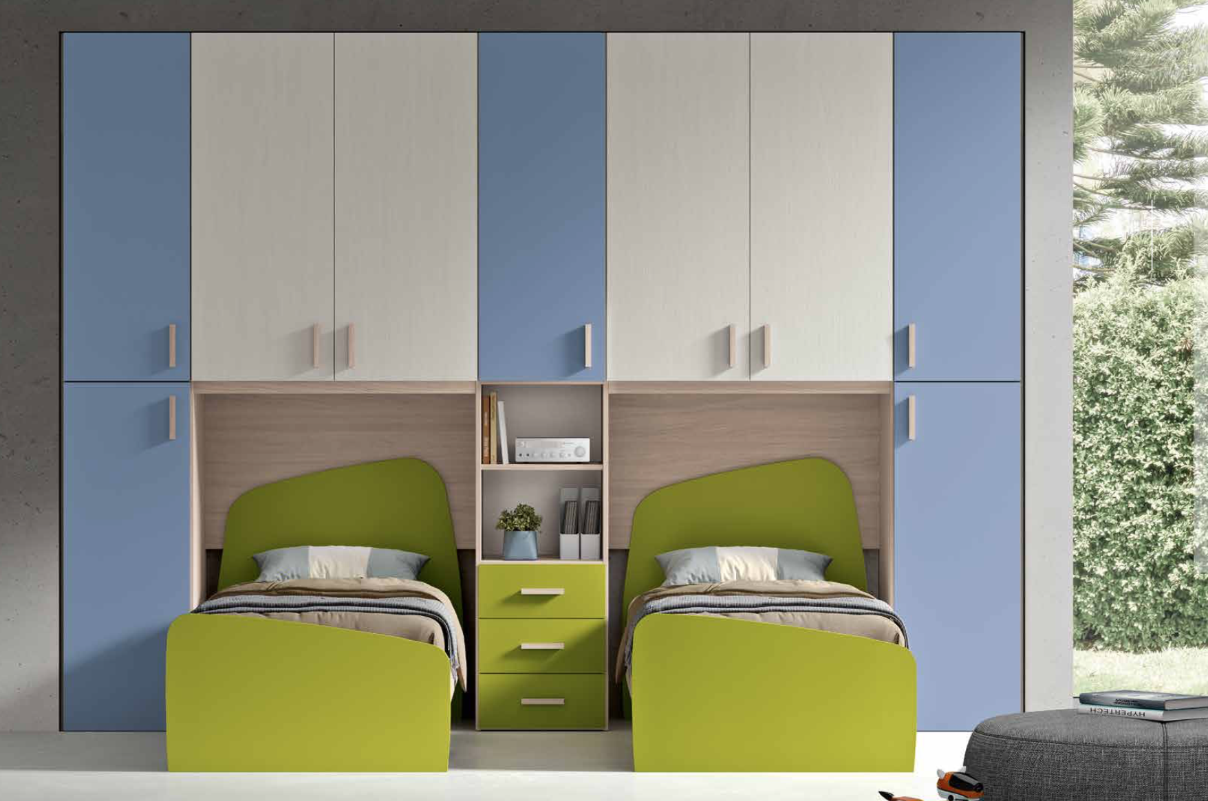 Composizione a doppio ponte moderna e funzionale, ideale per ottimizzare gli spazi in cameretta. Soluzione completa con armadiatura capiente e letto integrato, perfetta per ambienti dinamici e personalizzabili.