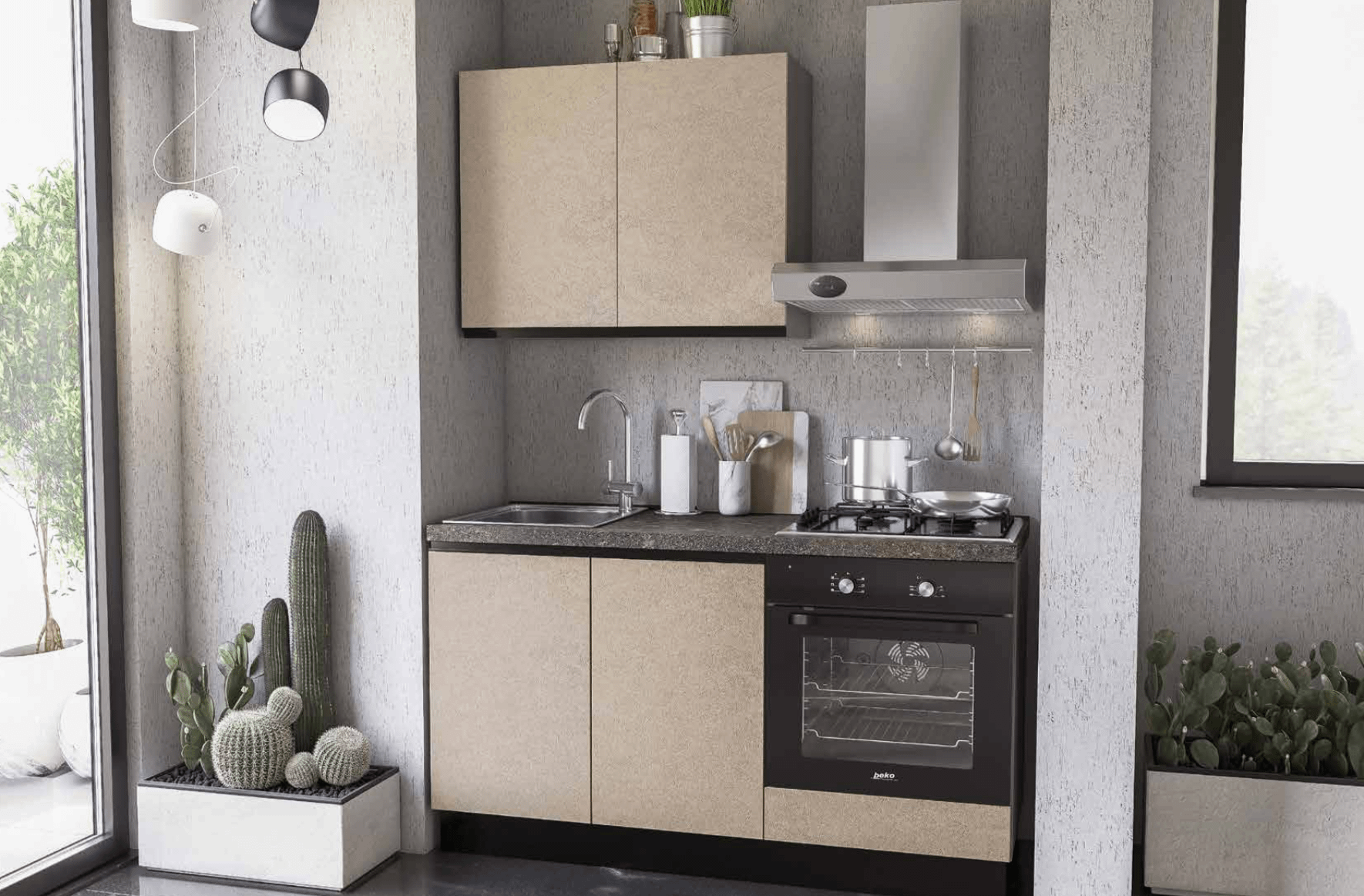 La cucina Mono 150 (150 cm x H216 cm) è la soluzione ideale per chi cerca una cucina compatta, elegante e completamente funzionale. Presentata con anta Emi a gola, la cucina è proposta nella versione Cemento Fango, con struttura nello stesso colore, zoccolo in alluminio e top in laminato H4 postformato.