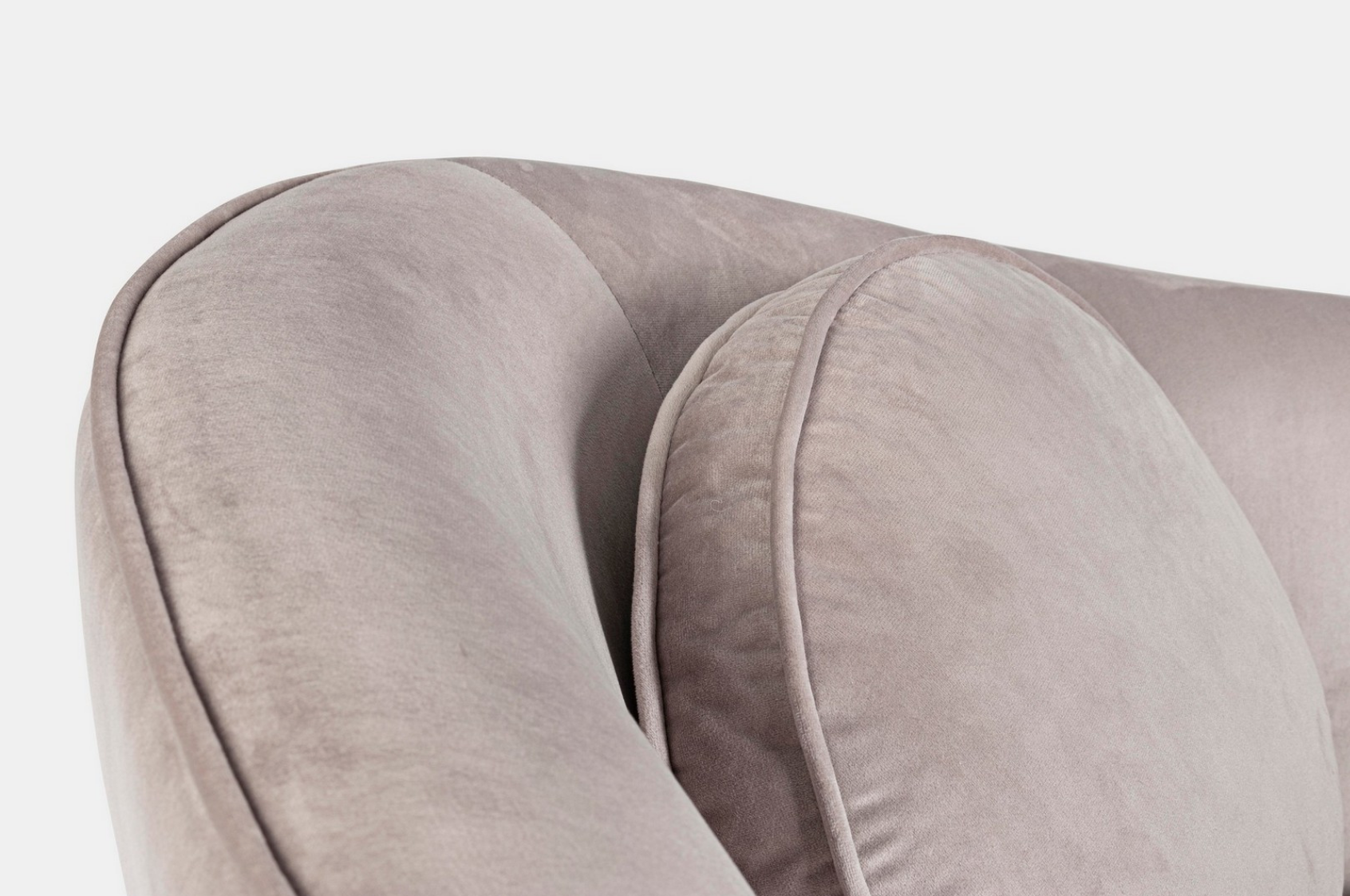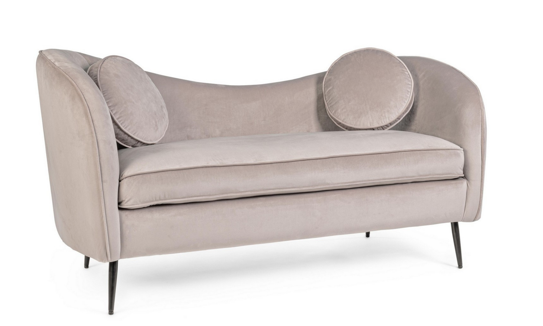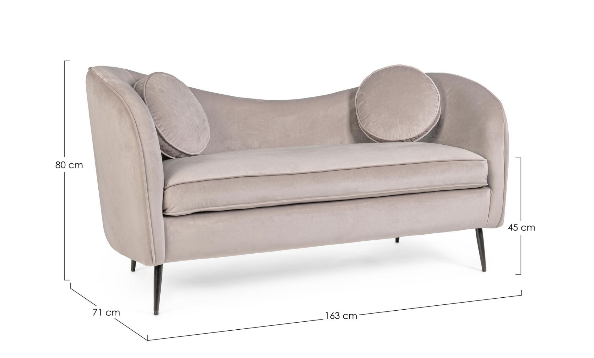 Il rivestimento in poliestere effetto velluto offre una sensazione morbida e piacevole al tatto, valorizzando l’estetica raffinata del divano. La seduta è confortevole grazie all’imbottitura in schiuma poliuretanica, con densità differenziate: 28 kg/m³ per la seduta e 18 kg/m³ per lo schienale, per un perfetto equilibrio tra comfort e sostegno. Completano il divano due cuscinetti sfoderabili, pratici e funzionali.