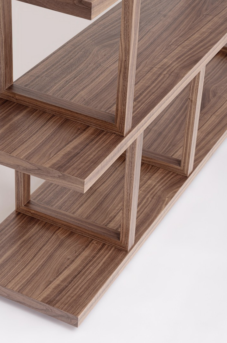 La struttura in legno di betulla garantisce solidità e resistenza, mentre le mensole in MDF impiallacciate in legno di noce donano calore e un’estetica naturale di grande impatto. La finitura con vernice a base d’acqua valorizza le superfici, rispettando al tempo stesso l’ambiente.