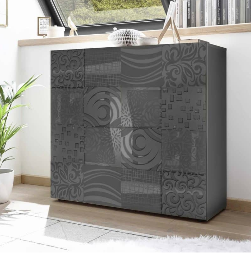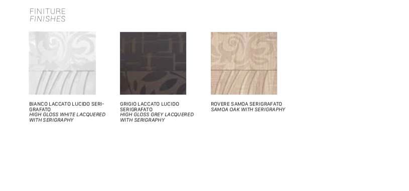 Questa madia contenitore a due ante è disponibile in diverse raffinate finiture: bianco laccato lucido serigrafato, grigio laccato lucido serigrafato oppure rovere Samoa serigrafato.