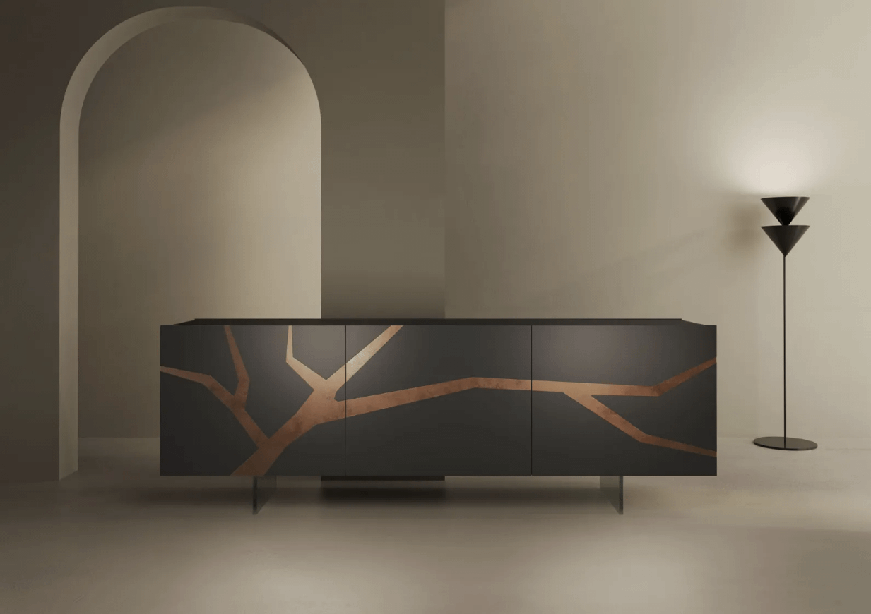 La struttura in finitura L076 Vulcano dona profondità e modernità, mentre l’inserto in foglia bronzo aggiunge un tocco luminoso e sofisticato, perfetto per ambienti eleganti e ricercati. Il contrasto tra materiali e finiture rende questa credenza ideale per soggiorni moderni, open space o sale da pranzo di design.