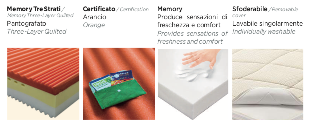 - a 3 strati ergonomici e alla presenza fi memory foam all’essenza d’arancia, che favorisce una piacevole sensazione di freschezza e comfort. Composizione interna: Strato superiore 5 cm di memory Foam all’essenza d’arancia- fresco , traspirante e confortevole. Strato centrale poliuretano a cellule aperte densità 28 kg/mq – traspirante e resistente . Strato inferiore: Poliuretano densità 30 kg/mq – per un supporto ortopedico equilibrato .