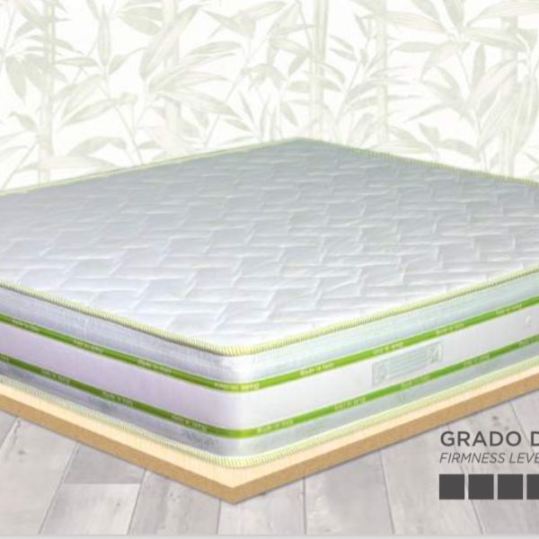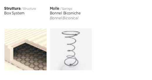 La struttura interna è composta da 600 molle Bonnel biconiche in acciaio, integrate in un sistema Box System con rinforzo perimetrale antisfondamento, che assicura robustezza, stabilità e resistenza anche in caso di utilizzo intensivo.