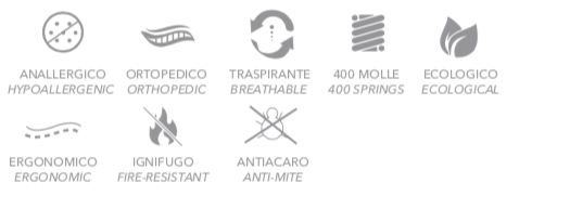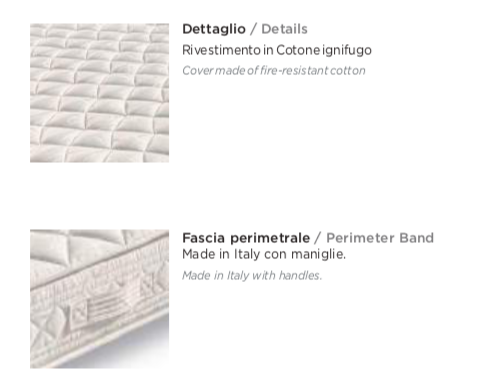 I pannelli sono trapuntati con tessuto ignifugo, progettati per rispettare le normative vigenti in materia di sicurezza antincendio. Il materasso è infatti classificato con classe di reazione al fuoco 1IM, con certificazione di prova n. 360371/RF7378, conforme alle normative UNI 9176:1998 (metodo D).