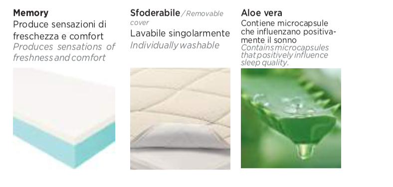 La struttura interna è studiata per adattarsi alle diverse esigenze del corpo durante il sonno: un lato in memory foam automodellante accoglie delicatamente il corpo riducendo i punti di pressione, mentre il lato opposto in poliuretano anatomico garantisce un supporto più sostenuto. Al centro, una lastra in poliuretano ad alta densità svolge una funzione ammortizzante, migliorando stabilità e durata nel tempo.