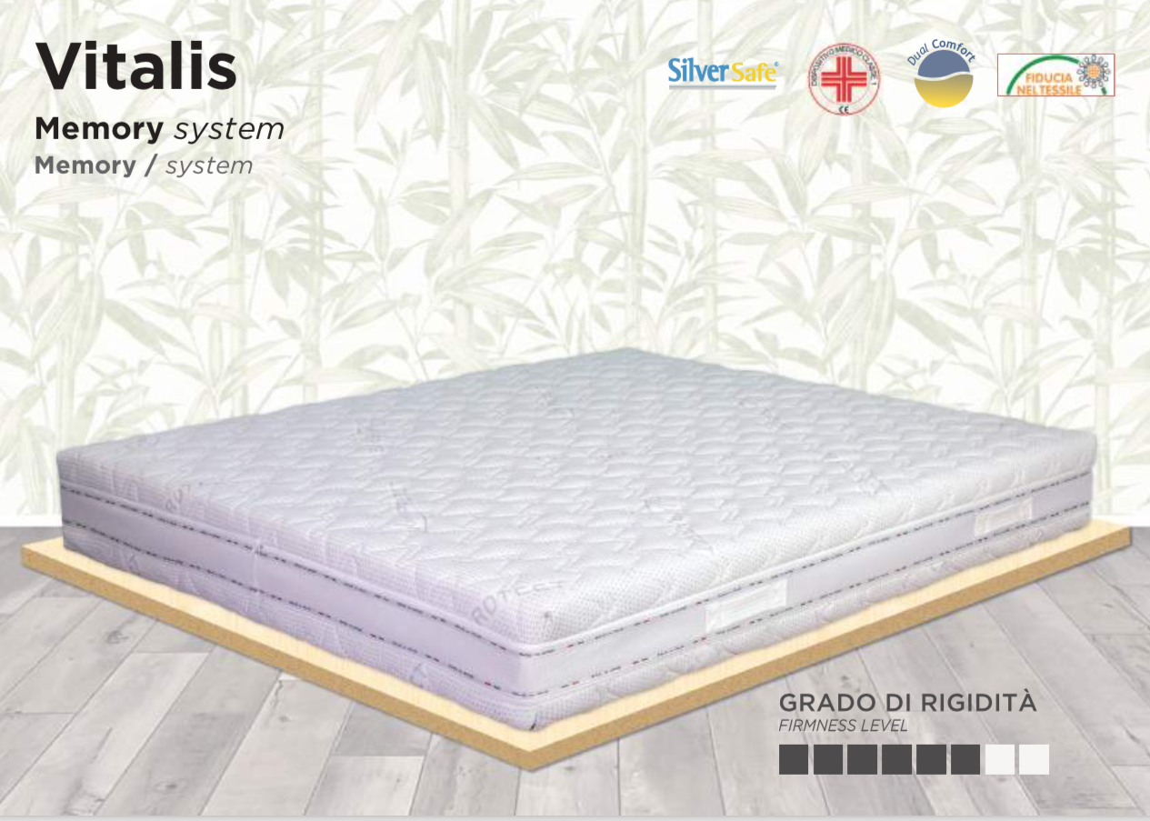 Scopri il massimo del benessere con il materasso Vitalis Memory, progettato per offrire un riposo rigenerante grazie a una struttura innovativa e materiali certificati di alta qualità.