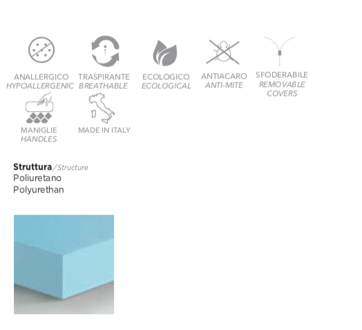 La struttura è composta da un’unica lastra in poliuretano a cellule aperte (HD17), progettata per garantire una corretta traspirabilità e un supporto uniforme durante il riposo. Questo materiale assicura comfort, elasticità e una buona durata nel tempo.