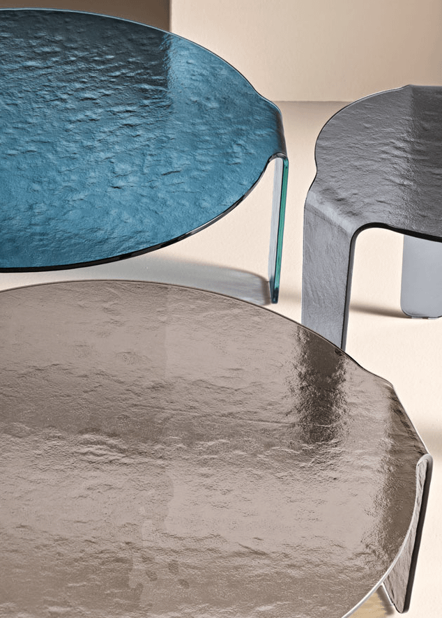 Tavolino in vetro curvato martellato trasparente.Dimensione cm 82x82Dimensione cm. 45x47vetro martellato.