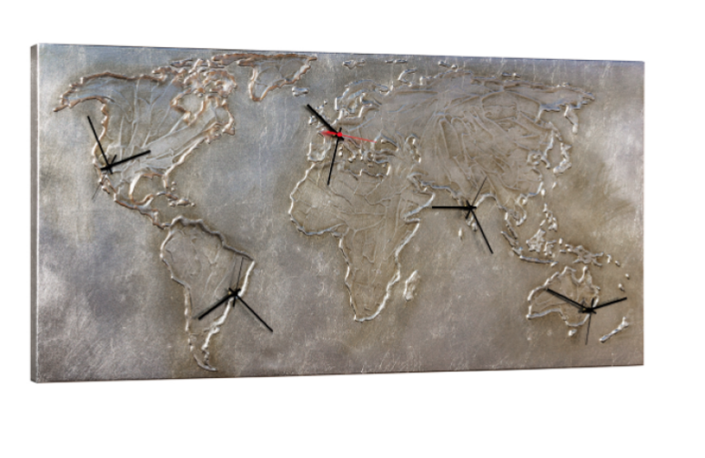 Orologio World Silver è una vera e propria opera d’arte decorativa, capace di unire design sofisticato e funzionalità in un unico elemento. Il suo particolare sviluppo su cinque quadranti lo rende un oggetto scenografico e di forte impatto visivo, ideale per ambienti moderni e ricercati.
