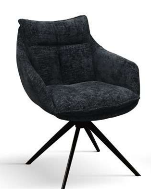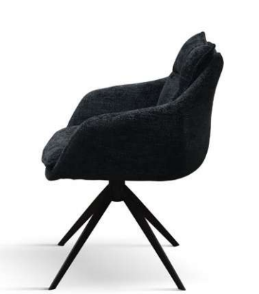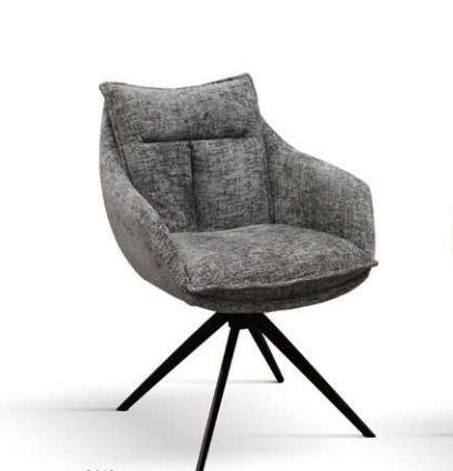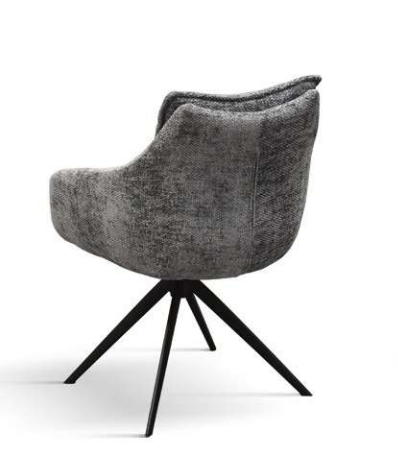 Sedia con braccioli dal design moderno, con struttura in metallo e seduta imbottita in tessuto disponibile nei colori nero o grigio. Ideale per sala da pranzo, soggiorno o ambienti contemporanei.