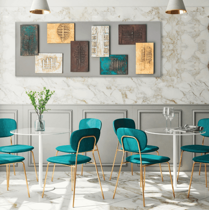 Caratterizzato da un telaio celato laccato in grigio tortora, offre un’estetica pulita e sofisticata, ideale per ambienti moderni e ricercati. Le otto decorazioni sovrapposte, realizzate e rifinite a mano, combinano tonalità oro, argento, nantokite e ruggine, creando un equilibrio armonioso tra luce, texture e profondità.