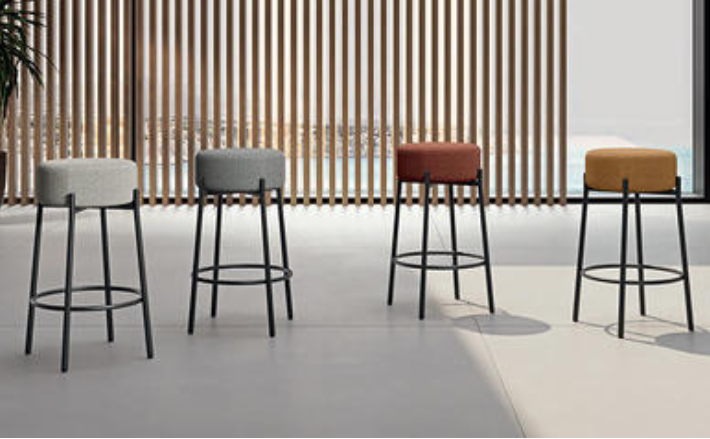 La seduta morbida in tessuto accoglie con eleganza, mentre la struttura in metallo dona stabilità e leggerezza visiva.