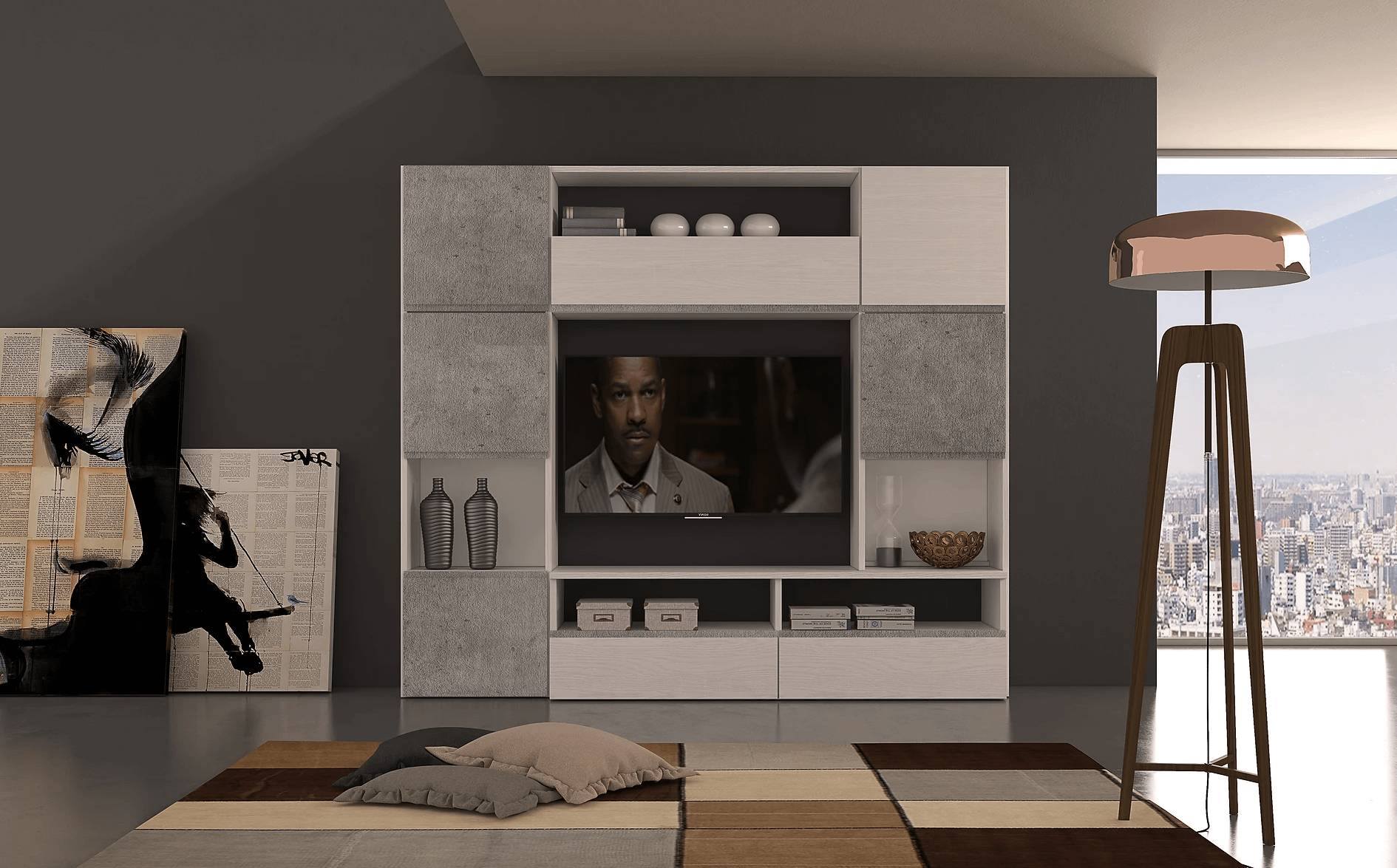 - SILVY LivingDESCRIZIONELa collezione SILVY si completa con il programma di pareti da soggiorno. Come per le camere, le finiture Cemento, Quercia, Frassino Gesso e la caratteristica maniglia a gola mono e bicolore danno vita a numerose soluzioni estetiche e compositive capaci di arredare lo spazio di piccoli e grandi ambienti living. Il gioco sapiente di pieni e vuoti permette di mostrare e al contempo contenere e il vano centrale dedicato al posizionamento della tv (fino a 70”) diventa protagonista.Soggiorno Misura L.242,5 cm.xH.208cm.P.45 cm,