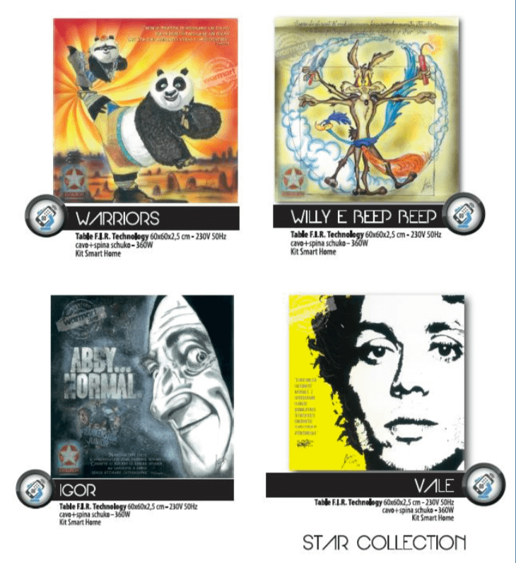 DECORAZIONI GAMMA WARM ART UNA VASTA GAMMA DI DECORAZIONI SU MISURA, COLORI E FINITURE, RENDONO LA GAMMA WARMART DELLA SERIE CRYSTAL, LA PORTA PER UN MONDO A SE, UNA DECORAZIONE SPINTA DEL DESIGN, CHE UTILIZZA UNA FUNZIONALITA ESTREMA DEL RISCALDAMENTO INFRAROSSO LONTANO. TECNOLOGIA UNICA BASATA SUL CONFORT ED IL BENESSERE, CHE SFRUTTA LO STESSO PRINCIPIO DEI RAGGI SOLARI. UTILIZZA SOLO LA GAMMA FIR ,COMPRESA TRA I 6-14 MICRON, CHE SI INTONA PERFETTAMENTE CON GLI SPETRI DI ASSORBIMENTO DELLA NOSTRA PELLE. DA UNO STUDIO DELL’ UNIVERSITA’ DI TOKUSCHIMA IN JAPPONE, SONO BEN 18 I BENEFICI CHE SI HANNO DALL’ESSERE IRRADIATO DALLA LUCE CALDA FISIOLOGICA: 1.Maggiore livello di ossigenazione del sangue. 2.Migliore respirazione della pelle. 3. Promuove una più rapida crescita di cellule sane. 4.Migliora il sistema immunitario. 5.Allevia i dolori muscolari ed articolari. 6.Attiva le molecole d’acqua nel corpo. ( anticellulite ). 7.Riduce lo sviluppo di batteri. 8. Stimola la guarigione e rigenerazione della pelle. 9. Può prevenire lo sviluppo di tossine nei muscoli. 10. Riduce la costituzione degli acidi grassi nei tessuti. 11. Riduce la crescita di batteri. 12. Riduce gli odori. 13. Assiste l’eliminazione di rifiuti e tossine. 14. Velocizza il recupero in seguito a traumi e chirurgia. 15. Contribuisce a migliorare il flusso sanguigno. 16. Fa bene per il gonfiore e dolore 17. Riduce il costo energetico 18. Può essere utilizzato continuativamente. TUTTA LA GAMMA E’ DOTATA DI TELECOMANDO CON FUNZIONE CRONOTERMOSTATO E GESTIONE DA REMOTO TRAMITE WI-FI. MISURA 60X60 CM.MISURA 60X100 CM. MISURA 120X60 CM.MISURA 120X80 CM.