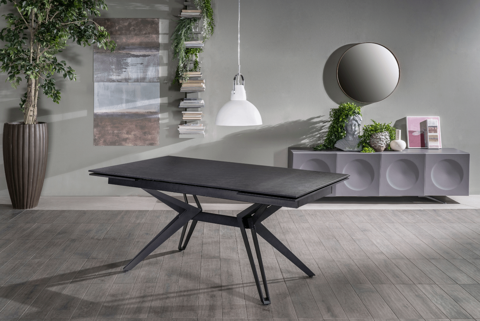 - Tavolo allungabile on top in ceramica , 4 gambe con barra centrale in metallo verniciato nero opaco. Finiture piana in ceramica