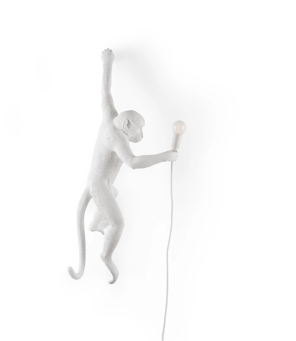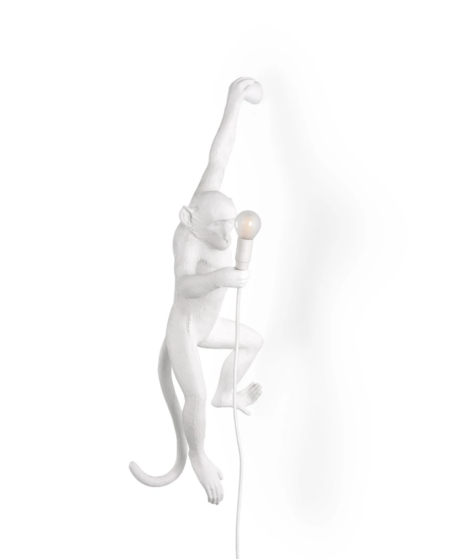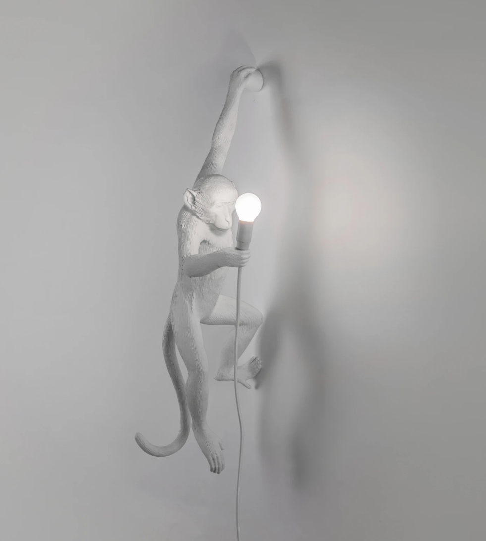 La protagonista è una simpatica scimmia in resina sintetica, raffigurata mentre si arrampica al supporto a parete con la mano sinistra, creando un effetto dinamico e tridimensionale. Con la mano destra, regge una lampadina E14, diffondendo una luce calda e accogliente che contribuisce a creare atmosfere intime e suggestive.